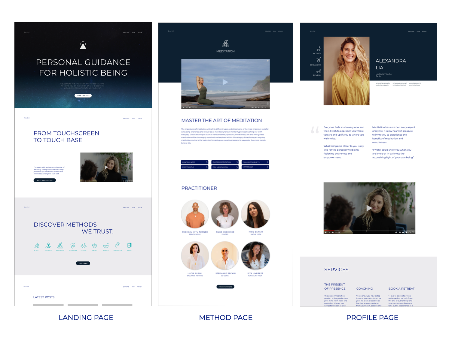 RAISE launched the first phase of the platform in November 2021. Starting with a website that features the first curated selection of methods, practitioners, and events. It will serve users as a “WIKIPEDIA”-like touchpoint for all topics in the realm of holistic well-being under the domain: www.raise.guide